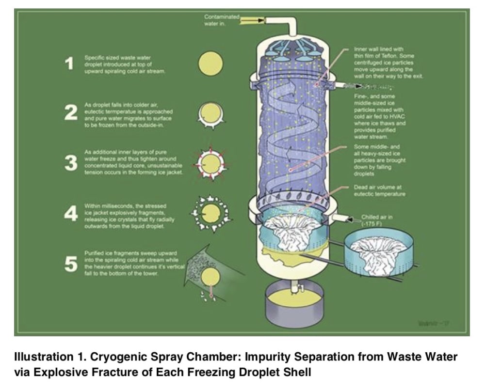 Illustration1 shows the process in a series of steps. The cold gases need to be extremely cold to inject large diameter droplets to permit large intake waste water flows and to reduce the time for phase transition.
