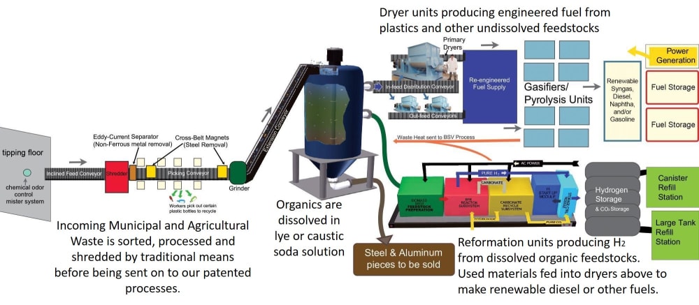 Solution: We have developed a revolutionary technology that directly converts all forms of organic waste directly into hydrogen. No digesters thus no gases like methane. The detail science is protected by 22 US and International Patents. In simplistic terms, the feedstock (such as organic wastes) is dissolved into to caustic solution. That solution enters a reformer vessel with a catalyst at specific temperatures and pressures. The result is hydrogen and a carbonate byproduct that is marketable. The carbonate contains all of the carbon, so no CO2 is released unlike current mainstream processes. The process can be taken even further resulting in a closed cycle process that regenerates the caustic feedstock for the input. TechnipFMC, a $13 billion International EPC, has reviewed our technology in detail and has declared in a letter to us that “…this technology will revolutionize hydrogen production.”