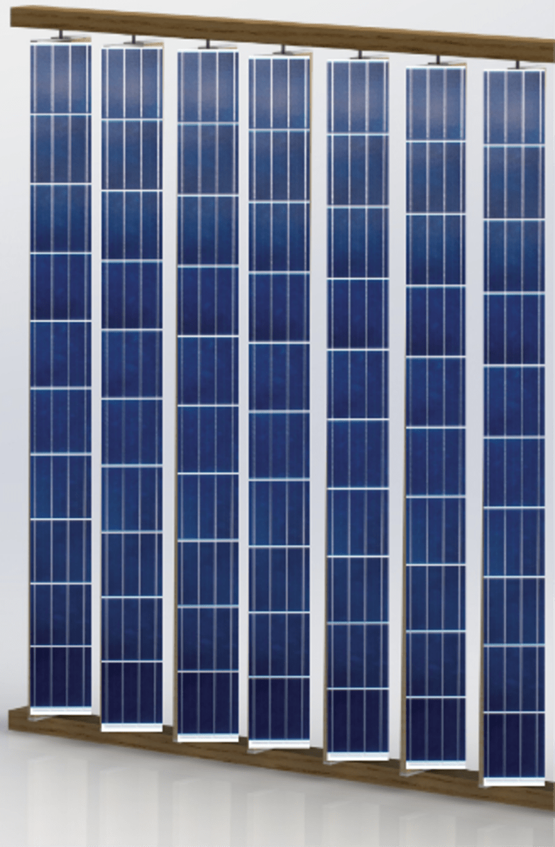 First, instead of a large solar panel that requires expensive tracking and cooling, this design uses small “slats”. A useful metaphor is a “Venetian blind” in which all slats rotate as a group. Each slat has multiple CPV chips on the top, each with a magnifying lens. The bottom surface of the slat has heat radiators to passively shed excess heat. The result is that this light-weight tracker is a natural fit for CPV cells. Second, the small size of the integrated tracker allows it to be used in all locations.