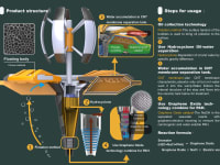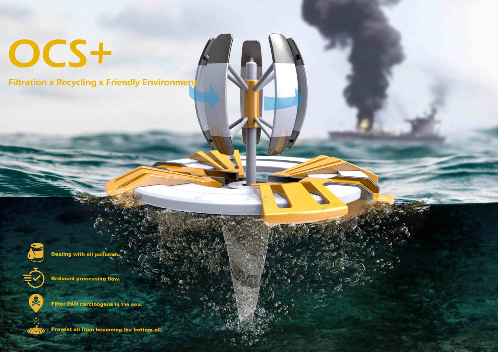 OSC+ collects top- and mid-level oil spills in sea physically. Powered by wind and sun, the pump generates bubbles from seafloor that carry mid-level spill to surface. The top-level spills are collected by water level difference generated by bubbling. The internal spinner performs the first oil-water separation. The oil is led to oil tank for second separation through nano-carbon membrane. The NaOH in the separated seawater reacts with graphene to remove the carcinogenic and water-soluble PAH before the water is discharged to sea. Finally, the oil collected in the oil tank is recycled.