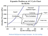 Theoretically, the energy extraction potential is augmented by the fact that a portion of the refrigerant fluid changes phase from a high pressure liquid to a low pressure vapor in an A/C or refrigeration system (i.e. containing R134a, R1234yf). A 70:1 vapor to liquid volume change ratio occurs during the typical expansion process as refrigerant passes from the high pressure region to the low pressure region though an orifice or expansion valve. This ‘explosive’ event (cavitation) is a compelling opportunity for power recovery from the refrigeration system by replacing the expansion valve with a motor. Power recovery at this point in the cycle, reduces the energy (enthalpy) content of the refrigerant as it enters the evaporator. Thus, the coefficient of performance is significantly improved due to an enhanced refrigeration effect and a reduction of the net power to operate the system due to the recovered energy. SAE PAPER #2012-01-1202 explains more detail of a successful prototype and the learning that generated a variety of related and critical US Patents. Some of the content is summarized below: