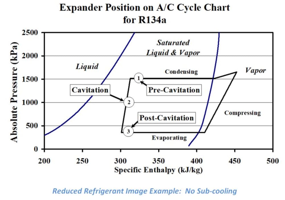 Significant technical challenges to manage the evaporator's required refrigerant mass flow for cooling and the mass flow through the power recovery hardware in prior art approaches under-perform at best. It turns out that the "sweet spot" where cavitation (explosion of liquid to vapor) occurs must be controlled to reside within the motor to generate profound power recovery. Physically, the expander-motor is between the condenser and evaporator. However, the phase change can occur before or after the expander-motor and thus forfeit significant power recovery. The "location" of the phase change depends on the ability to empty the low-side of refrigerant. If the pumping (compressor) is somewhat aggressive, the cavitation event likely occurs ahead of the motor (near the condenser). Conversely, liquid refrigerant can flood through the motor with cavitation happening in the evaporator with a less aggressive pumping action.