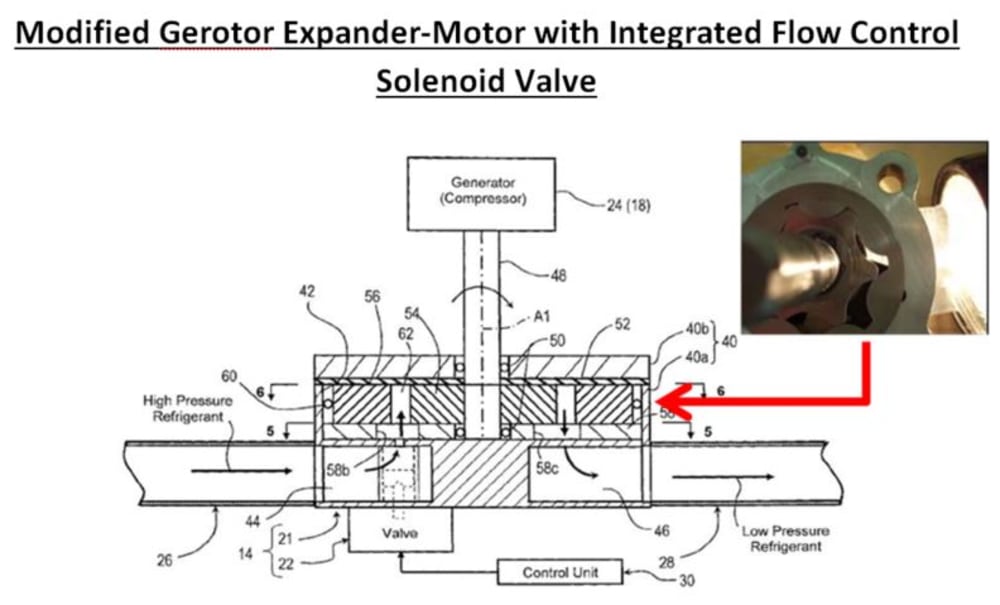 This technical challenge was met by the introduction of a low pressure drop solenoid valve just upstream of the expander-motor that is managed to maintain the evaporator's target low pressure and temperature conditions. In effect, liquid refrigerant is backed up to be released through the motor as needed.