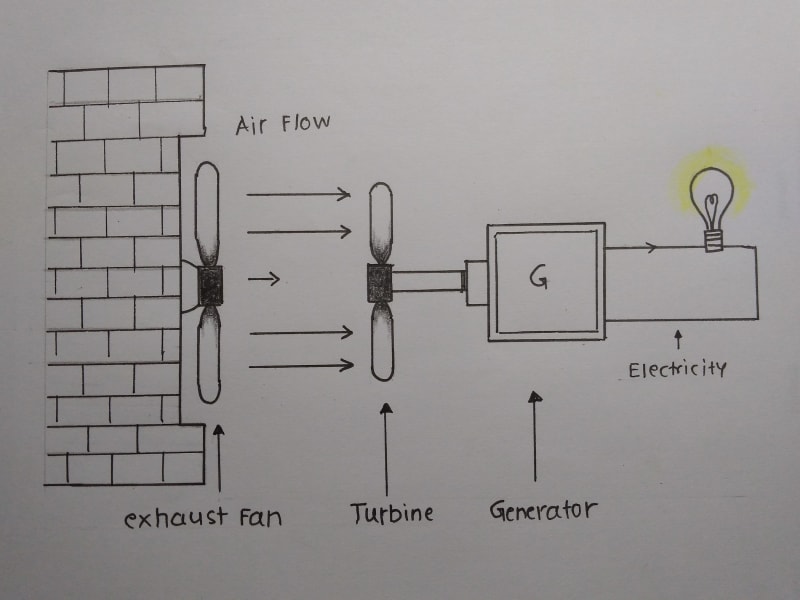From home, offices, to industries there is great demand for a variety of exhaust fans. Exhaust fans are available at various specification such as RPM, watts, current, speed. etc. Most industrial units vary huge and high speed exhaust fan are required which runs continuously. Such exhaust fans consume a large amount of electric current and energy, An attempt is made in our project to utilize the exhaust fan air flow (exhaust wind) to rotate the blades of a turbine which is coupled to an electric generator. It is like a wind energy generator. When the exhaust fan turned ON, the exhaust high speed air flow (exhaust wind) turns the blades of the turbine, which ultimately rotates the generator. The generator converts mechanical power into electric energy. This project may be applicable to small scale energy generation. The electrical energy may be stored in rechargeable batteries, a super capacitor or any other mode of storage mechanism. The stored energy can be used for inverters etc. For greater efficiency of this system exhaust air flow can be focused directly through the pipes at the turbine blade.