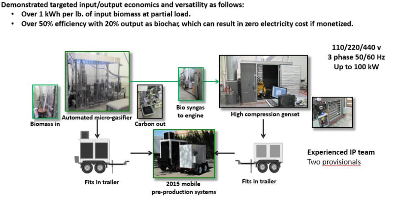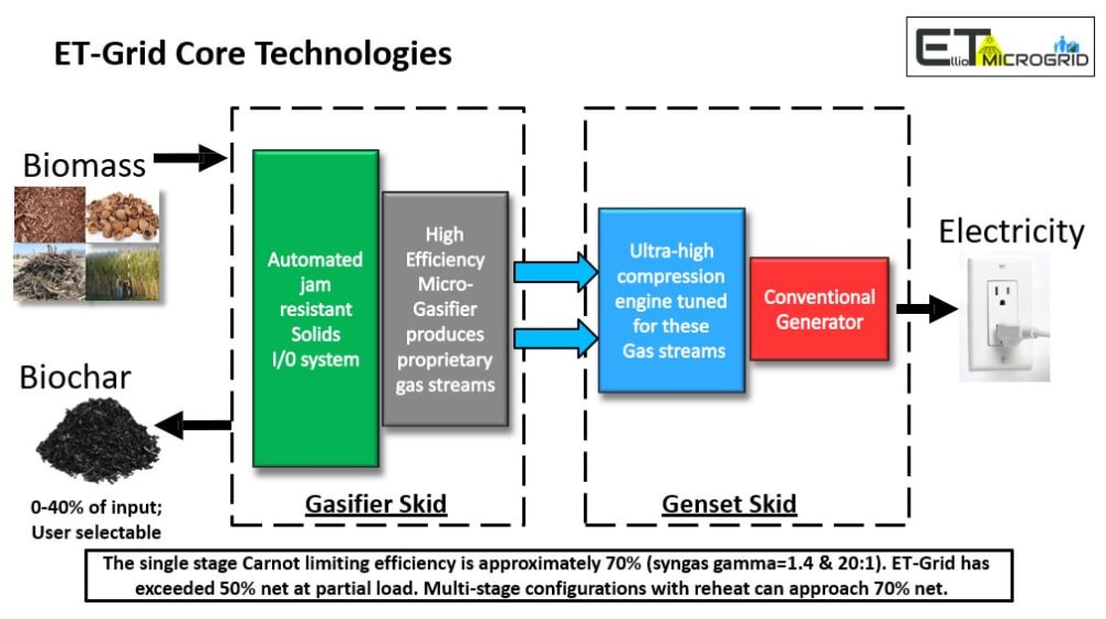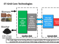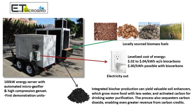Carbon Credit Customers can buy an annual subscription for each ET Microgrid. Each ET Microgrid offsets up to 250,000 tons of carbon per year. End users get a portable microgrid that provides constant 5kW electricity, heat for boiling water, and biochar material for soil remediation. Carbon rich biomass (such as corn) is heated in an oxygen starved process that produces synthetic natural gas and biochar.