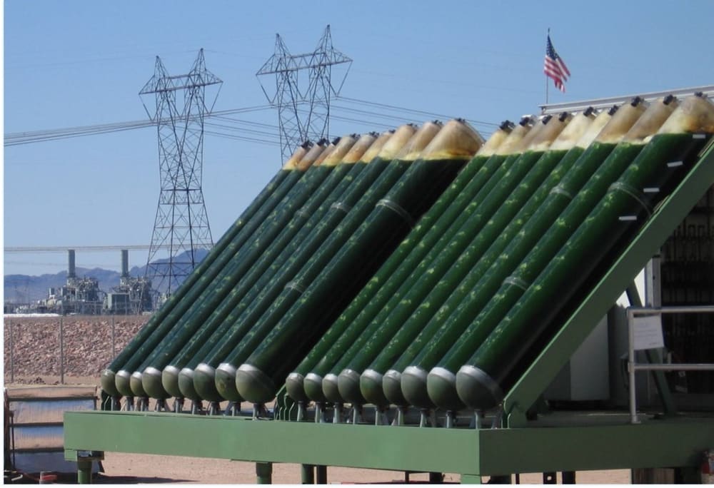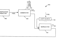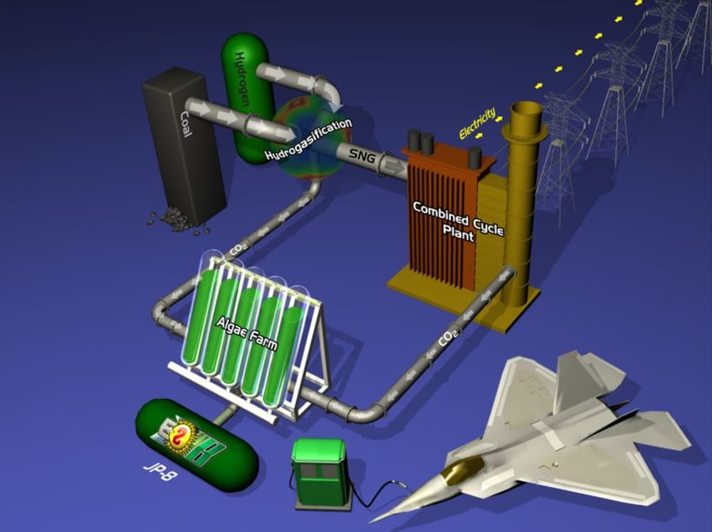 Unlike traditional traditional gasifiers which inject oxygen into coal, the coal is 'gasified' into synthetic natural gas (SNG) in a reaction with hydrogen in a pressurized reactor to produce methane (CH4) while minimizing the production of carbon dioxide. Additionally, the reaction uses less water than coal ignition. The resulting SNG can be transported on existing natural gas lines. The use of SNG is much cleaner than coal, which prolongs the need for plant rebuilds. The downstream flu gas is passed through a scrubber before being injected into specially designed bioreactors hosting natural microalgae. The algae feed on the continuous stream of carbon dioxide and grow at an exponential rate using photosynthesis. Algae is then 'harvested' daily to produce useful products from fertilizers to fuels in the refinery, at far less the cost of soybeans or corn. Water used for the algae can be recycled from existing cooling ponds, while the refinery utilizes super-critical CO2 for oil extraction from the harvested biomass. The biomass can be sold for cosmetics and feed-stock for aquaculture. The algal oils can be sold on the market, or treated using hydrolysis to form fatty acids for higher values. The fatty acids can be treated with decarboxylation to produce straight hydrocarbons. The hydrocarbons can be sold for biodiesel or further refined using hydroisomerization and distillation to produce high value JP-8 fuel.