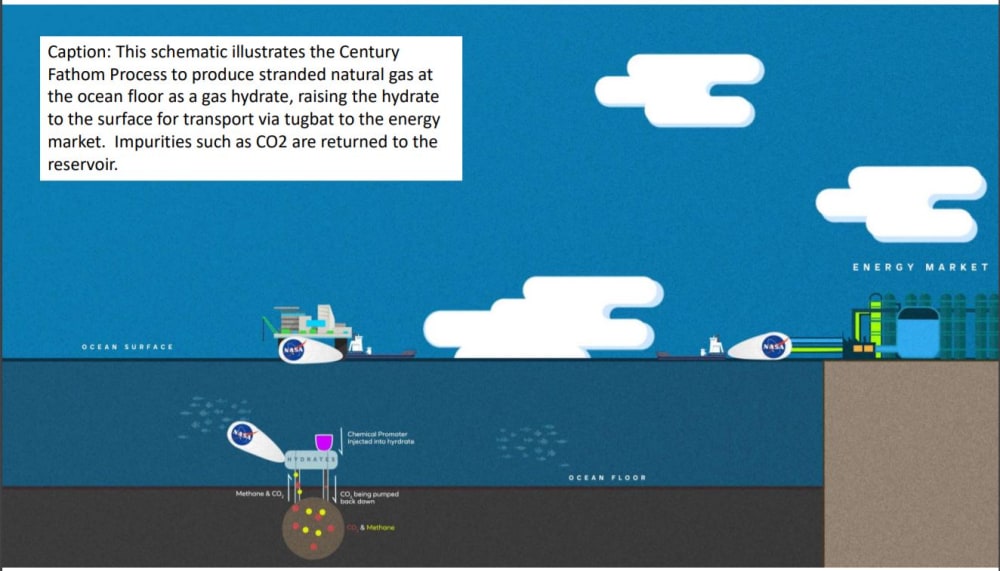 Recognizing that hydrates form rapidly and vigorously at the sea floor, Century Fathom exploits this phenomenon to transform subsea natural gas at the ocean floor to an artificial natural gas hydrate. NASA pressure vessel expertise has been utilized to design a vessel with features of strength, flexibility, and neutral buoyancy to enable this operational concept. Filled storage containers are subsequently raised to the ocean surface. The Century Fathom hydrate containers float so they can be tugged to the destination market, at less cost and energy consumption than traditional cargo ships or LNG carriers.