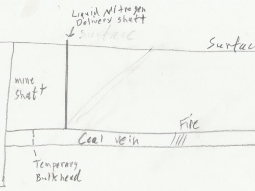 Depending on the area and layout of the individual mine fire; one or more delivery tubes are drilled down to be close the burning coal veins. Temporary bulkheads may be necessary to force the Liquid Nitrogen into the coal vein. Once introduced,