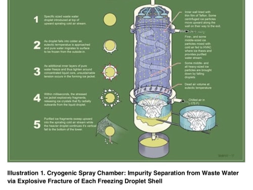 A spray of spherical wastewater droplets into an extremely cold gas causes an ice shell to form and grow thicker and thicker as it falls downward in the spray chamber.
