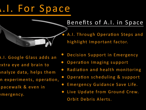 A.I.With Google Glass help astronauts in all operating conditions and save their time to read handbooks And Give Guidance in Emergency conditions. Artificial Intelligence Convert humans in Transhumans Have Extra Calculating Abilities. A. I.