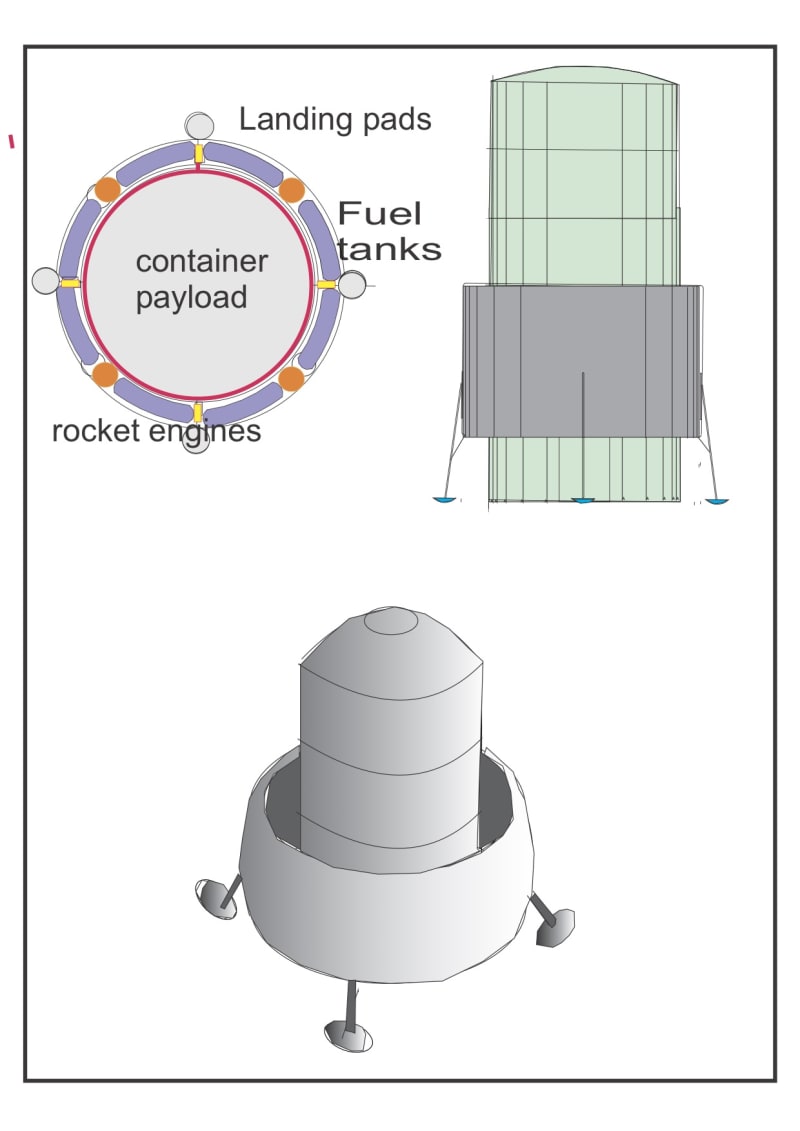 A ring shaped vehicle to allow the positioning of the container inside the vehicle. This spacecraft will contain the engines, the fuel, the navigation and communication systems, the foldable landing gear, landing pads and any equipment for autonomous, safe navigation.