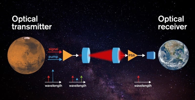 In this work, we investigated essentially all viable options for transmitting information with laser beams with the target to find the best possible solution in terms of receiver sensitivity. We found this, and verified it in a laboratory experiment. It relies on a novel type of optical amplifier that, in contrast to all other known amplifiers, does not generate excess noise, a so-called phase-sensitive parametric amplifier. The sensitivity, which is often measured as the needed number of optical photons (light particles) per information bit, reached in our experiment is a world-record; 1 photon per bit. We also showed that this approach is the best-known approach to transmit data across very long distances at high bit rates. The above lab experiment was conducted at 10 Gbit/s, but we estimate with realistic assumptions that it possible to use this novel approach to send data from Mars to Earth at a bit rate of 1 Gb/s, which is about a million times higher than today. While our experiment was conducted in a bulky setup with the amplifier being about size of a desktop computer, we have recently implemented this in a very compact chip platform having a 2x1 cm footprint.