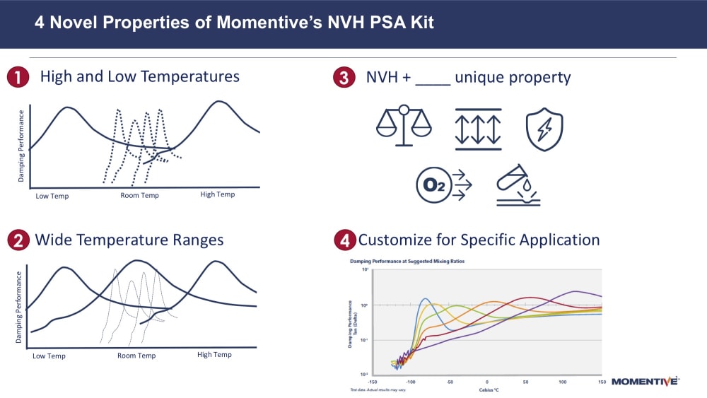 Momentive's NVH PSA kit, is a brand-new & commercially available product that allows an end user to custom formulate in order to meet the damping requirements of a specific application. The NVH PSA kit is novel due to 4 specific reasons.