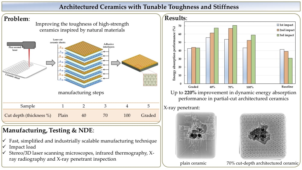 Stereo/3D laser scanning microscopes and nondestructive evaluation (NDE) techniques including infrared thermography, X-ray radiography and X-ray penetrant inspection were used to assess the architectures before and evaluate the multiscale damage after each impact. It was found that the multilayered architectured ceramic systems with a partial-cut depth (i.e., 40% and 70%) exhibited higher dynamic energy absorption performance (up to 220% for the 3rd impact) and higher stiffness (up to 80% for the 3rd impact) than the multilayered plain ceramic. The results showed a bell-shaped response in the partial-cut architectured ceramics, indicating tough materials (opposed to the plain one) and superior multi-hit resistance owing to the energy dissipation mechanisms including plastic deformation in adhesive interlayers and inter-cuts, crack deflection, frictional energy dissipation due to tile sliding (absent toughening mechanisms in the plain system) as well as ceramic fracture upon flexural cracks in the partial-cuts and delamination crack (absent mechanisms in the 100% cut-depth architectured system).