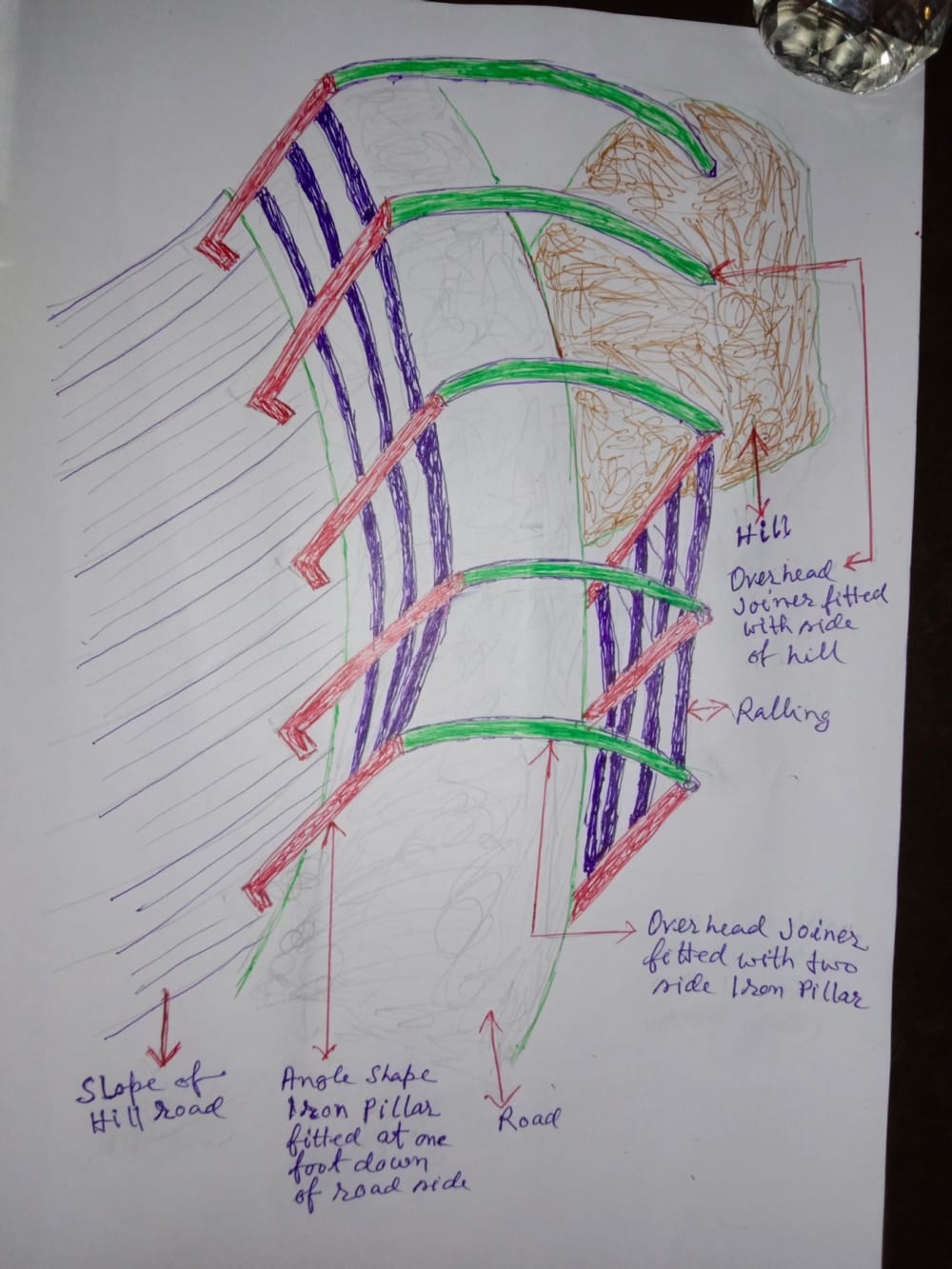 To make this system we need strong and wider iron to be fitted as pillar at the one foot down of the end side of the road. Every pillar to be fitted by keeping gap four to five :feet. Same process will be done at opposite side, if there have no down (i. e. there is present hill) the pillar of angle to be fitted at road side. Now to be joined an another angle, at the top of two side pillar. If possible at the hill side this overhead joiner may be fitted with the hill directly avoiding the pillar and for this the cost will be less. The canal side (down side) pillars to be joined by strong iron flat plate from bottom to eigth feet height by keeping gap two feet.