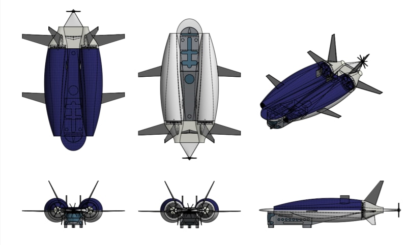Now, lets dig into the specifics of the design. The Airship is designed for a passenger capacity of 10-20. This is to limit the size of the airship which helps to improve the stability and reduce the chances of failures drastically and allows for a comfortable and stress-free transport. The airship is fully autonomous and can be remotely maneuvered by an on-ground pilot and can fly at various altitudes making it safer and efficient. The twin split-contra rotating ducted propellers have a great thrust to weight ratio making it more efficient. The structure and cabin are made from composite materials making it lighter and stronger. The skin of the airship uses tear-proof material with high tensile strength to withstand the helium pressure inside. The helium used to inflate is critically warmed and maintained to achieve efficient buoyancy to volume ratio. The airship is fitted with lithium-ion batteries which are used for storage of electric power while the airship runs on power generated from solar cells and RAT system instantaneously. As a safety measure in an emergency for the passengers, the cabin can safely detach from the inflated carrier and land safely using parachutes.