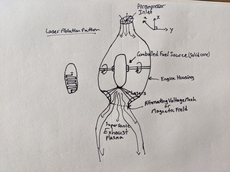 This is the basis of my idea: Using lasers to ablate a solid material, and in the process harnessing the supersonic velocities of the ablated plasma (atoms/ions) to propel an air/spacecraft.