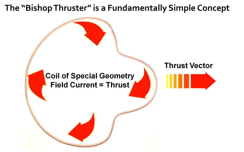 While the output from a single coil winding maybe too weak to be detected by modern measurement devices, calculations suggest that a coil with many windings could produce a usable and scalable thrust vector. In addition to increasing the thrust be increasing the number of windings relating to the coil of a special geometry, placing the coil of special geometry into a powerful magnetic field could increase the mass of the electrons in such a way as to greatly increase the thrust vector. Another possible effect could be the localized stiffening of space in the opposite direction from the thrust vector. Since this is a non-Newtonian thruster, the direction of thrust and the direction of travel are the same. By stiffening space in the wake of the Bishop Thruster an effect similar to a toy boat being propelled by the surface tension induced by a piece of soap in the water at the rear of the toy boat. Since energy requirements are relatively low and the required energy could be harvested during the trip, constant acceleration and deceleration may be possible.