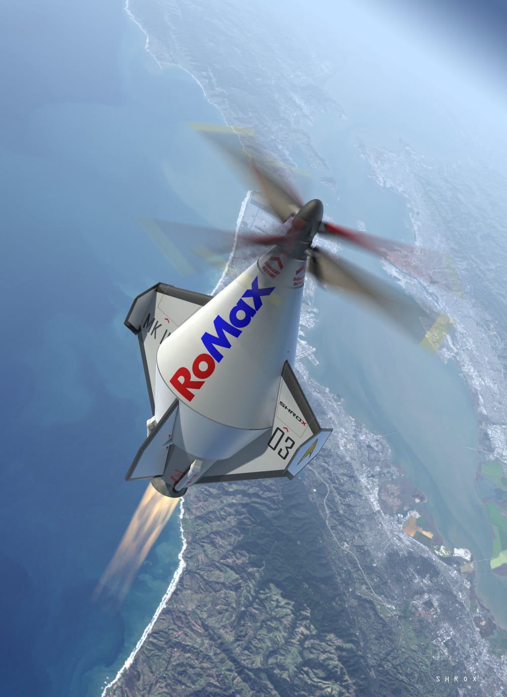 Romax ascends like a fast rising drone, saving it's solid core rocket motor for use when it's safely and comfortably several thousand feet aloft. This allows Romax to beat any jet cargo in cross country runs, and in intercontinental excursions.