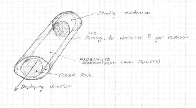The system must be compatible with most versions of PG Harnesses, that's why the final design is still to evaluate further. I consider to use a CFK housing which contains the pressure reservoir, all the electronics and a cfk pipe which acts as a barrel to shoot out the parachute. The parachute should be shot either backwards or sideward from the flying direction to prevent as much as possible a tangling or twisting with the main canopy if deployed.
