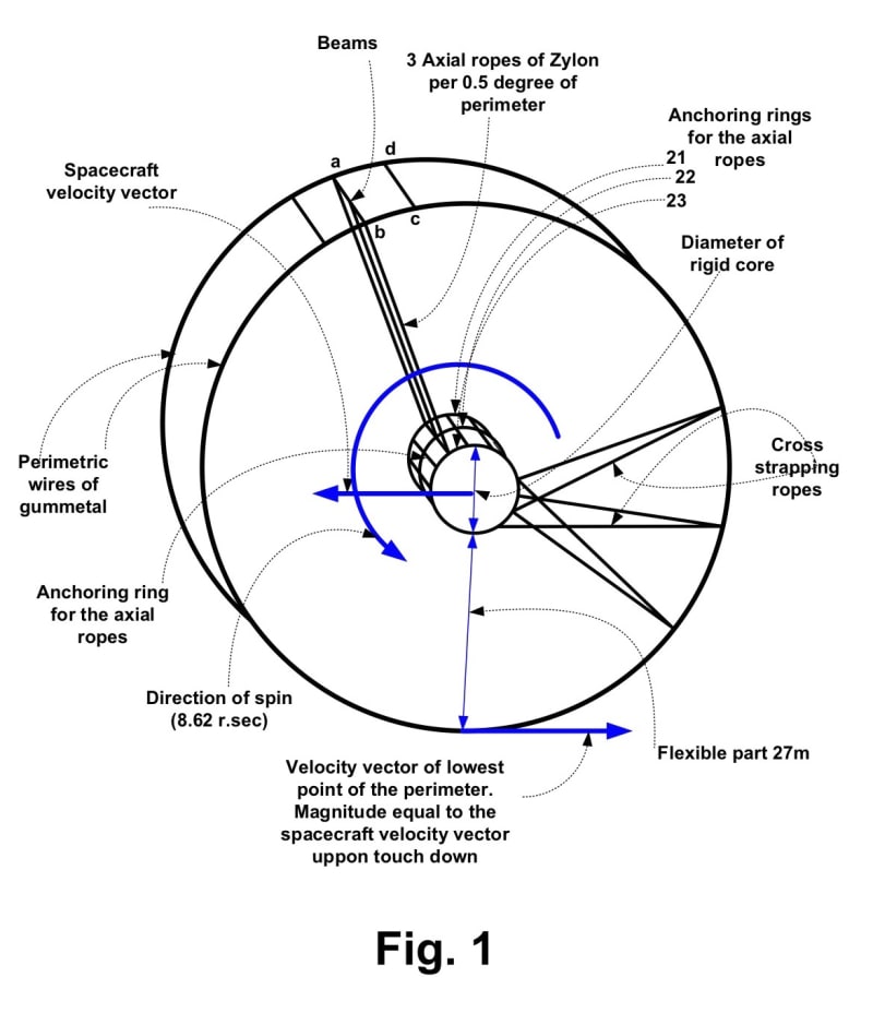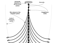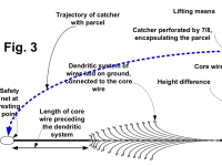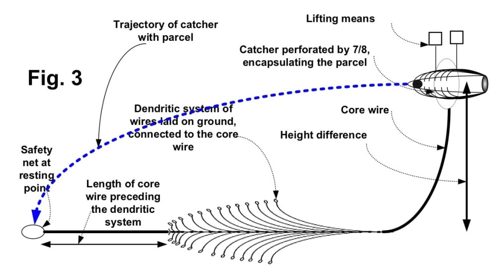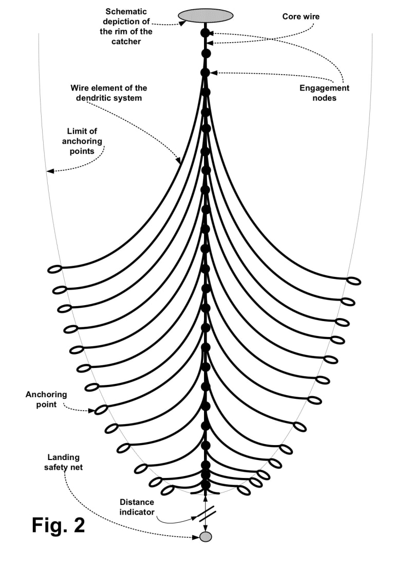The central wire is pulled by the rim and in its turn engages mechanically the successive segments of the dendritic system, gradually absorbing the kinetic energy of the payload. When all the kinetic energy of the payload is eliminated the payload falls on a safety net.