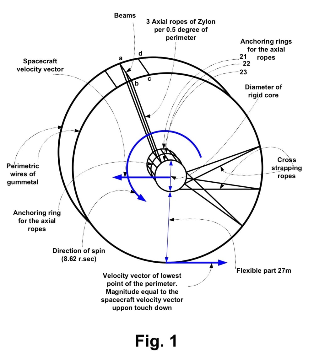 OPLONAS is configured as a wheel-shaped spacecraft that has a rigid cylindrical core of 6m diameter and 9m length. The cylinder possesses three or more rings from which emanate radially ropes of high tensile strength of 27m length, which further hold when extended a perimetric surface consisted of gummetal based wires and connecting beams. The flexible elements of the spacecraft are wrapped around the rigid cylindrical core, for launching it in a compact format. While on orbit around the Moon the spacecraft targets a flat area for landing and enters spin motion. It releases the flexible part gradually to its full extend. Spinning up to 8.62 rev/sec before forcing the spacecraft to land it gives it gyroscopic rigidity and stiffness to negotiate obstacles and anomalies on the ground. The obstacles and soil consume kinetic energy till its rests.
