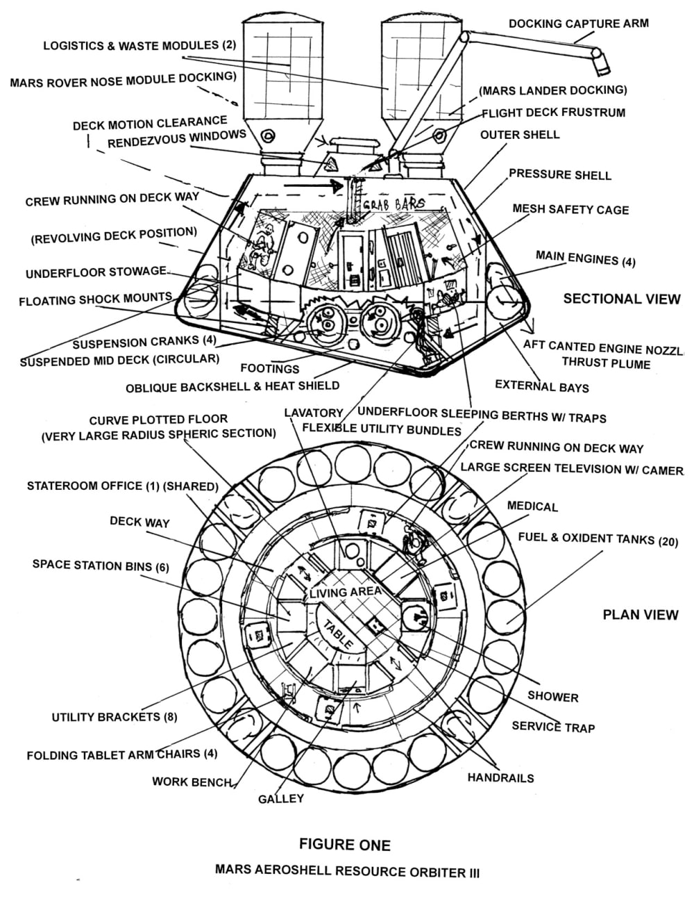 Orbiter is 34ft in diameter, having a truncated regular upper cone and an oblique backshell and heat shield. It is launched by a large carrier rocket and inserted by an upper stage into a trajectory to Mars.