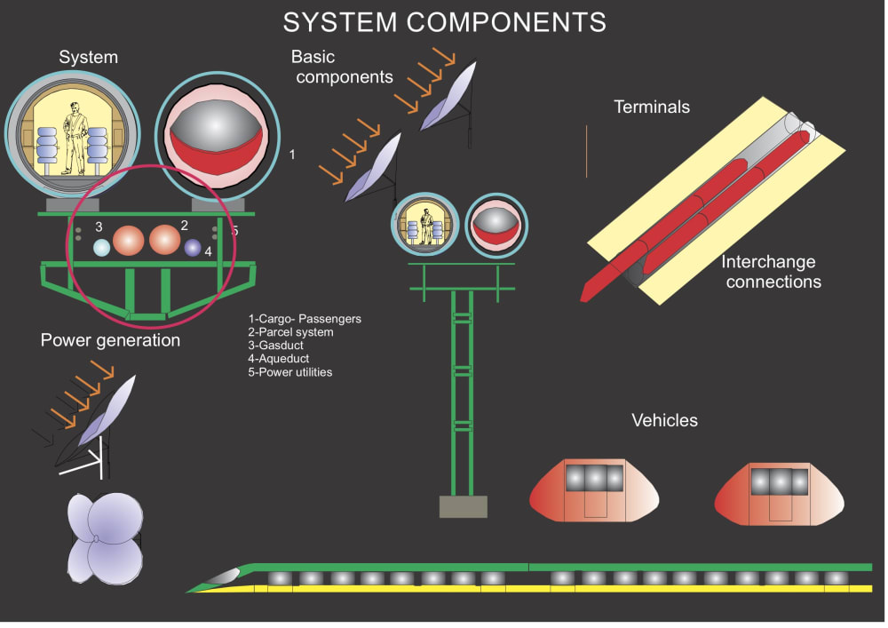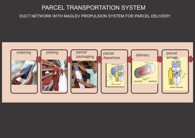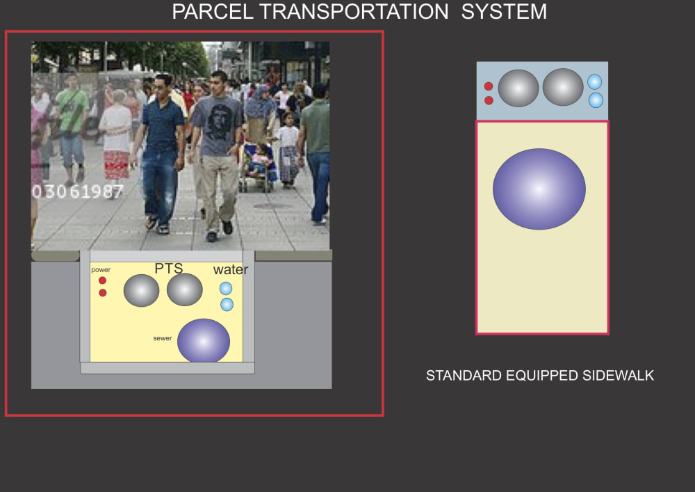 PTS is an independent system to move small packages or parcels, by utilising modular and standardized containers running through a dedicated pipeline system connecting terminal points powered by a maglev system.. The network: The network is formed by a system of duct lines, The duct lines have a similar size to HVAC ducts, about 35 cm diameter while the mobility is guaranteed by an electrically powered mag lev system. The parcel containers are of modular dimension, ranging from to 30x40x40 to 30x40x60 cm. They are moved inside the network by a mag lev system to guarantee high speed and powered by outside locally produced clean power. Their dimensions will allow the transportation of such items as, shopping, waste, catering and most common small size products. The terminals: The system connects the terminals, which has a receiving and shipping part. They are located in all residential units, work locations and shopping, waste and other facilities. The network can be housed in a bigger TransNet system together with other medium for passengers and cargo, utilities, gas , oil and water pipelines in the territory, while in the cities they can run in the underground part of existing sidewalks properly equipped. In the buildings in vertical and horizontal ducts connecting domestic terminals.