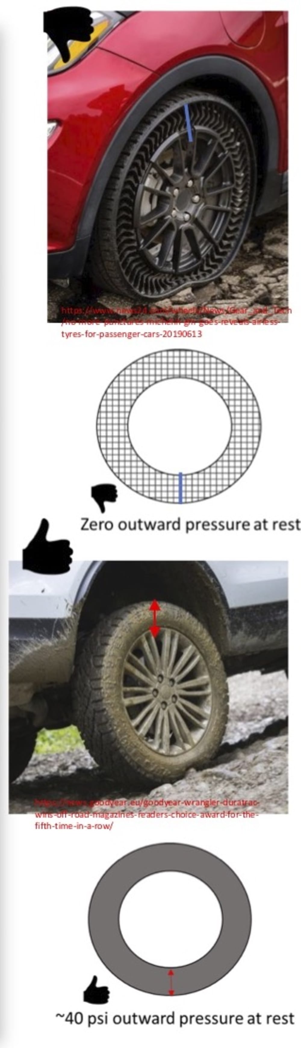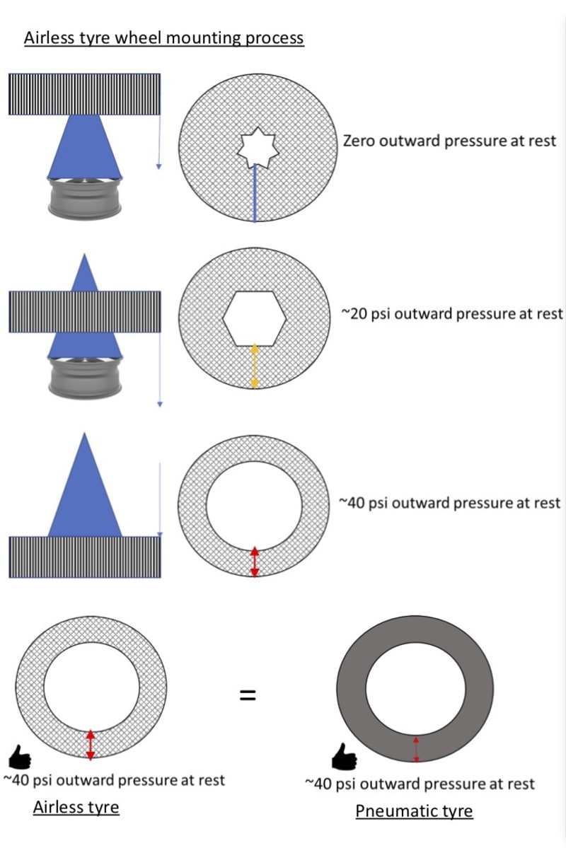 In order to make an airless tire work like a pneumatic tire, the airless tire at rest must provide an equal outward pressure to that of the pneumatic tire. This way when the airless tire is under load of a vehicle with i.e. a rock under the tire or cornering at speed the tire won't deform tragically like a zero outward pressure airless tire.