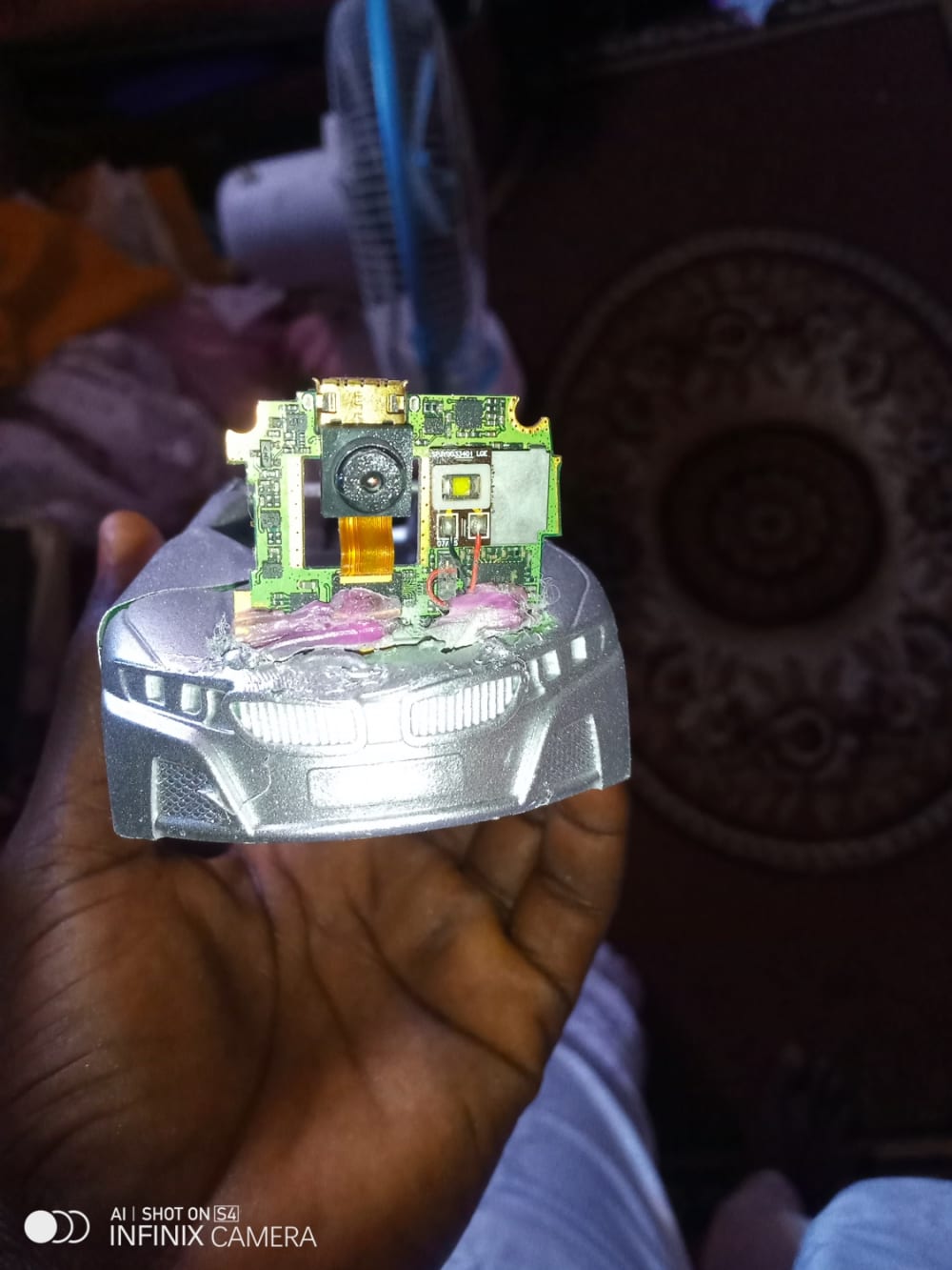 My robot spying car is a rechargeable, normal wireless device with 5-6 microcontrollers. Besides recording audio and video, it also has internal memory for saving data. The car doesn't operate using only hand controllers; it can move with the direction of my voice and orders, However, for now it can only recognize my voice but I believe when improved my two spying devices can serve as cinch ingredients for better security in Nigeria.