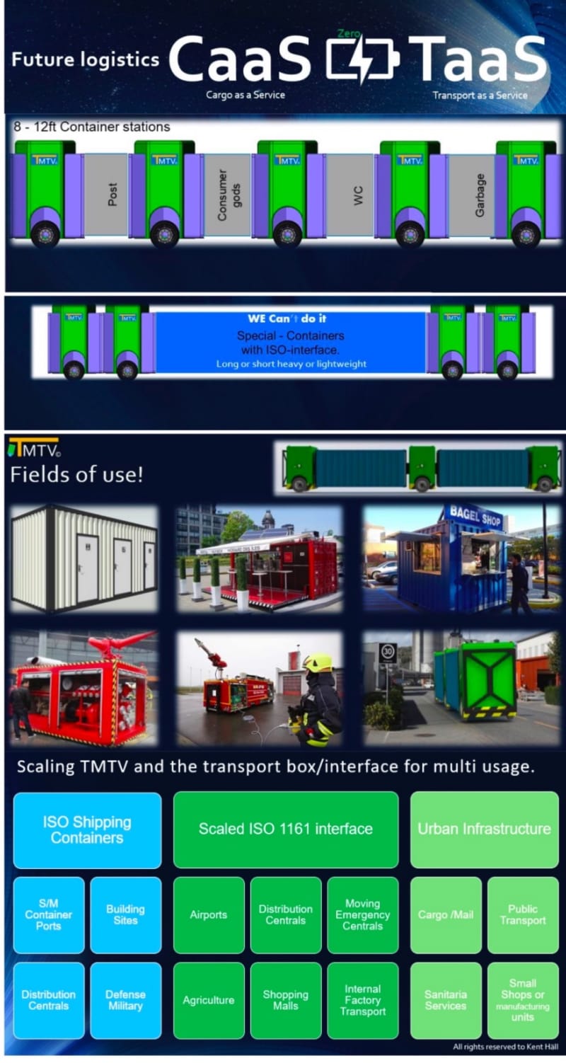 - If we then scale this interface to half or less, the opportunities expand to new use areas. Having a scaled-down version in a factory, airport, or hospital, the internal transport of people or cargo could be done by a swarm of TMTVs. The scaling can be such that the boxes can be fitted into a 20ft or 40ft ISO-Container for longer transports by full-size TMTVs to other destinations in the City.