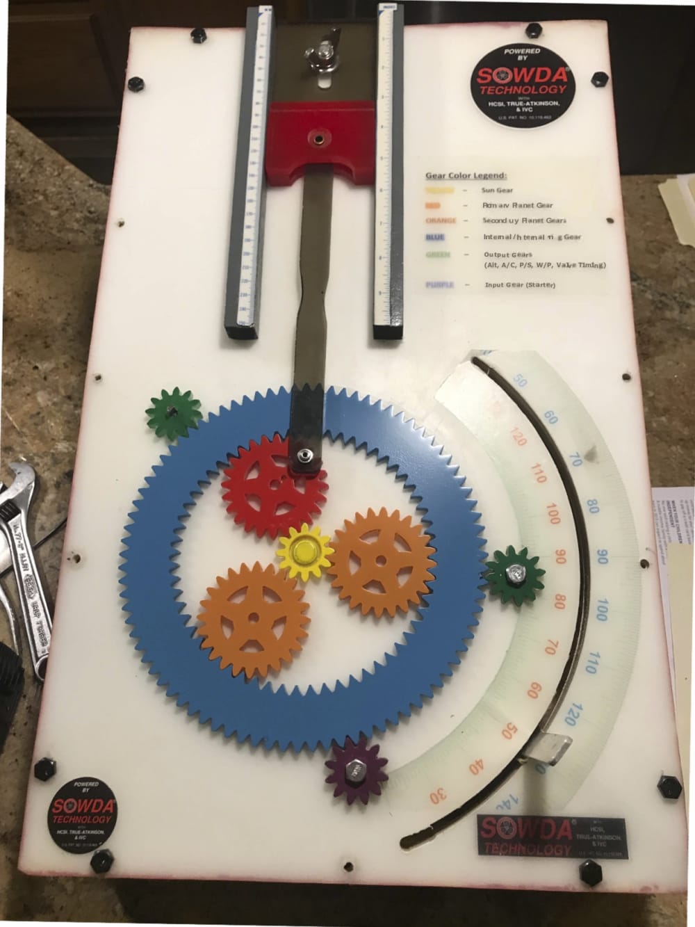 The Sowda® Engine is a trademarked, patented, “Revolutionary yet Simple,” gear-based crank assembly mechanism. This engine has an Infinitely Variable Compression (IVC) adjustment from 8:1 to 24:1 (or much higher whereas the prototype is 40:1 ratio) for dual-fuel (gasoline-diesel) capability. This engine (4-stroke only) has True Atkinson with up to 50% longer power/exhaust strokes over the intake/compression strokes. The Sowda engine does not utilize a multi-journal crankshaft. The Sowda engine utilizes one crank-pin per cylinder with a single-piece connecting rod and low friction roller bearing verses plain bearings. Better fuel economy and lower emissions is obtained by incorporating the Sowda gear-based mechanism into any piston-driven, 2-stroke or 4-stroke internal combustion engine (ICE). The increase in engine efficiency is obtained by: utilizing a True-Atkinson (TA) cycle; Infinitely Variable Compression (IVC) ratios; and applying low friction components.