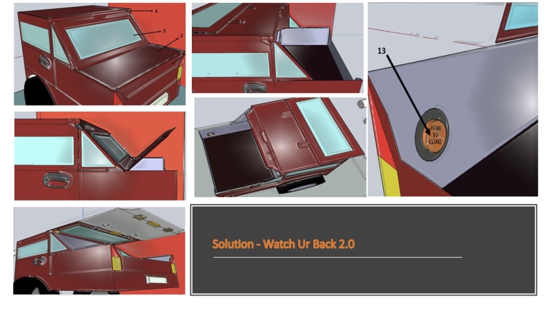 The new boot lid design AKA "Watch Ur Back 2.0" allows the complete boot lid together with the rear window to submerge on top of the roof of a car. Allowing the user to have enough space and safety to load or unload their equipment without having the scare that the boot lid might hit them on the head, or hit some other nearby car, or end up injuring other people in the parking lot.