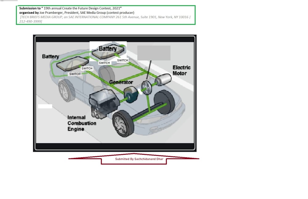 SUGGESTION: It is suggested that the battery be divided in 2 halves of equal capacity. One half to be in use at any time, for driving the vehicle. Other half should be kept in charging mode, while the vehicle is running on one battery. For charging the other battery, there should be a small Engine Driven Generator on board. This engine could be either Petrol/ Gas or diesel driven. Sufficient fuel to be stored on board the vehicle.