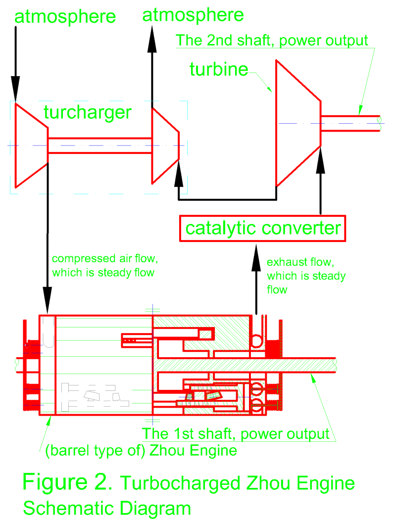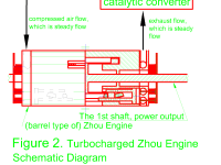 Thus, the turbocharged Zhou Engine can recover the residual pressure in its exhaust directly, easier and thoroughly, rather than only recover the waste heat as the current engines. It highly raises the thermal efficiency (maybe over 60%), power density, and exhaust purification. It can use in any field which has air and fuel and needs motive power, such as in a car, ship, aircraft, power plant, etc. Widely using it will reduce consumer spending hugely and be made for cutting down carbon emissions, saving natural resources, and protecting the environment. We are seeking users, partners, and financial support for it.