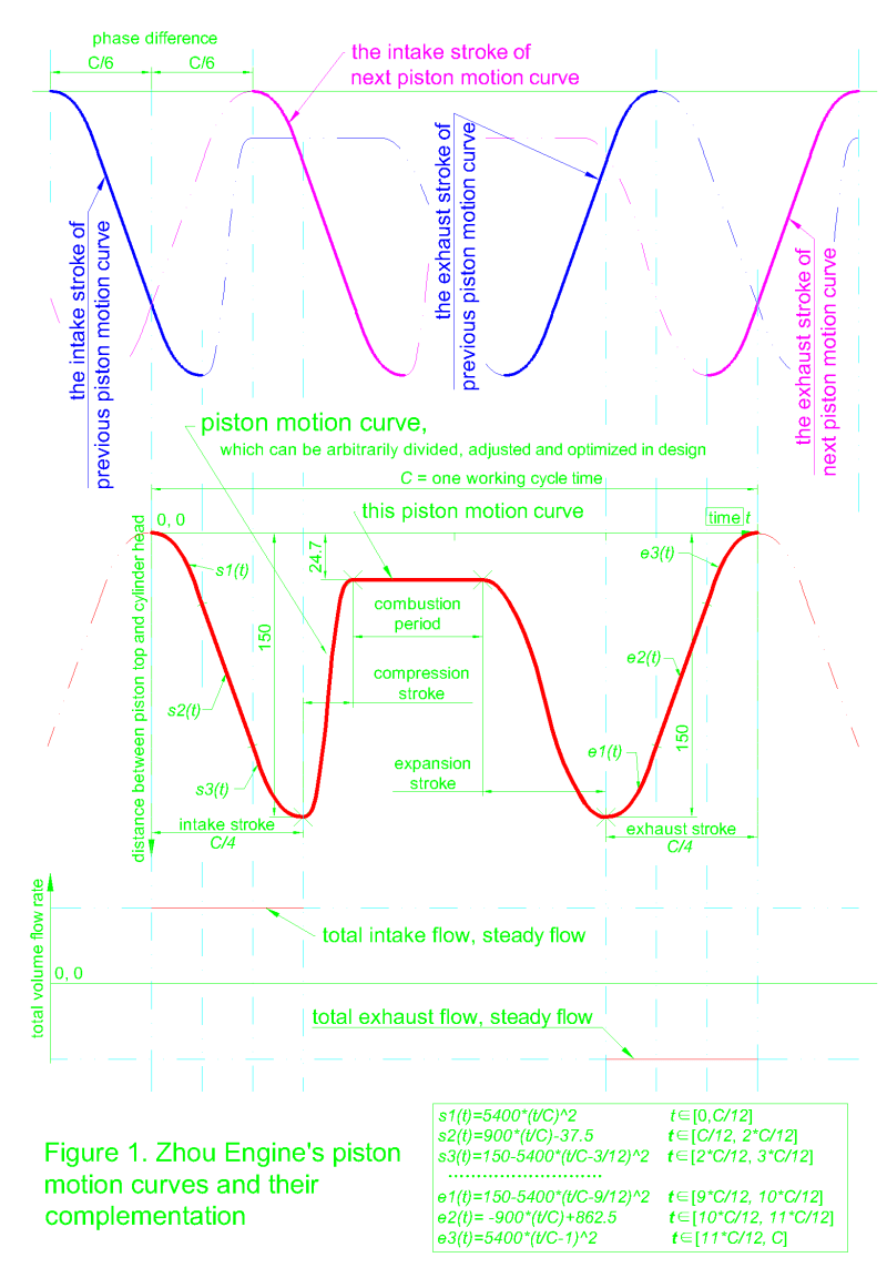 This invention, Zhou Engine, is an IC engine and also a combustor. It uses one power-cam driving all its pistons rather than crank-link mechanisms to force its pistons' motion along an "optimized curve" rather than an approximate sine curve that of current engines. We can skillfully design the "optimized curve," make its pistons' motion complementation, produce steady flow in its intake and exhaust, and best match turbines. Thus, a Zhou Engine, turbines, and aerodynamic compressors comprise a turbocharged Zhou Engine. For the detail, please see https://www.linkedin.com/pulse/turbocharged-zhou-engine-jing-yuan-zhou, which thousands of professionals have viewed.
