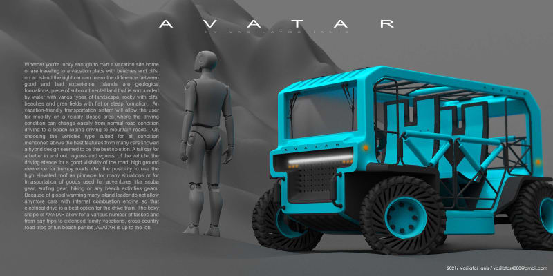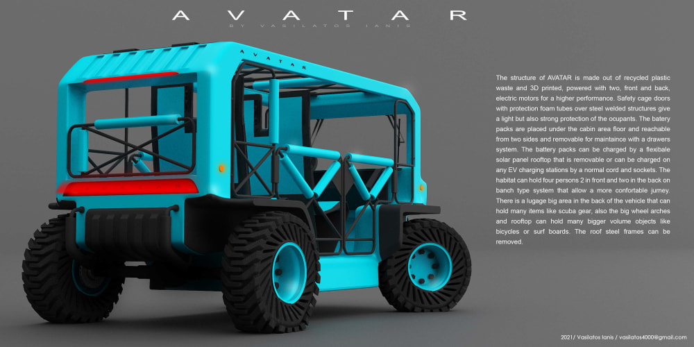 The Avatar represents the ability to have the family unit or say couples holiday shared in such a way to bring that unit closer together and the use of electric motors allows the facilitation of more conversation bringing more enjoyment to the experience as well as that extra feel good about creating the least amount of damage to the environment.