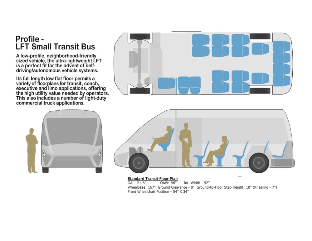 The battery-electric LFT is specifically designed for a Zonal-based system! A number of patentable processes and design features comprise its unique ultra-lightweight, highly rigid composite body shell construction. Impervious to the elements, a composite body shell offers superior noise/vibration absorption qualities, a low COG and air ride suspension coupled with spacious seating for a quiet, limousine-like ride. A low-floor with kneeling feature offers a mere 7.5” ground to floor step height for ease of access for all, and enables the use of a simple one-piece slide ramp for wheelchair passengers/mobility challenged. It features a 64” wide rear liftgate/ramp that accommodates access/transit needs for extra-wide wheelchair clients and gurney/non-emergency patient transfers.
