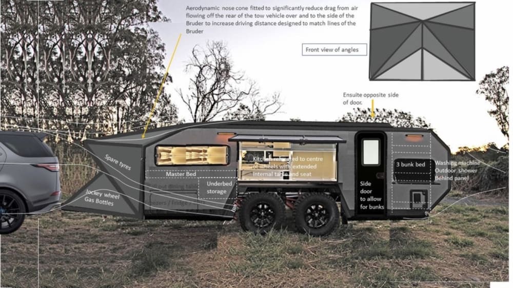 Upon viewing other caravans it became apparent that no caravan maker addresses the aerodynamic drag caused by the flat shape of the front of the caravan nor the turbulence thus drag built up during travel between the tow vehicle and caravan wasting money on fuel, car parts on additional wear and lost time at destination.