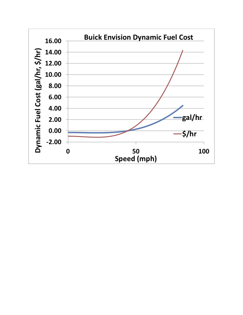 ValueGauge consists of a microcomputer and display unit that connects to the vehicle’s On Board Diagnostic (OBD) data port. Most of the components are available from our sponsors. Instead of a simple data reporter like other products, ValueGauge learns your vehicle’s behavior and develops a mathematical model of fuel consumption, and computes and displays fuel efficiency as Dynamic Fuel Cost, or DFC, using our proprietary algorithms. Dynamic Fuel Cost relates the cost of fuel in relation to time at the wheel, in those common, simple units of dollars per hour. A chart of the steady speed DFC for my Buick Envision is included as Figure 2, with curves for DFC in both gallons per hour and $ per hour as a function of speed. Note that the values are negative at less than 45 mph, meaning faster travel reduces both fuel consumption and travel time. The speed for highest fuel mileage for this vehicle is 45 mph, where DFC is zero. At speeds above 45 mph, travel times decrease but fuel consumption increases, causing DFC to increase in a non-linear manner, rising to $14 per hour at 84 mph. Data on a dozen vehicles show similar results.