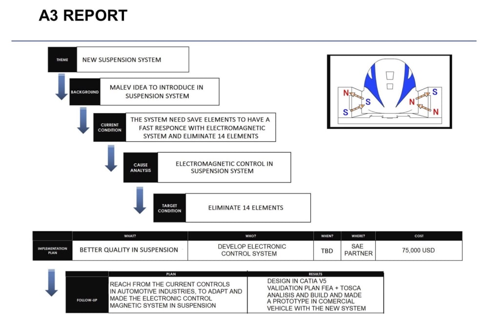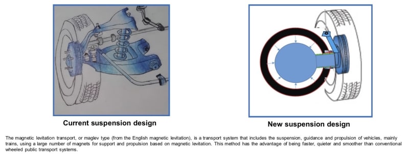 Taking the Maglev design as a preamble, now it is to introduce it to the suspension system eliminating components such as shock absorbers, springs, bushings, masses and bearings. This system would be achieved with an electrical system with inverters and capacitors where they can generate a magnetic field and counteract the weight of the vehicle.