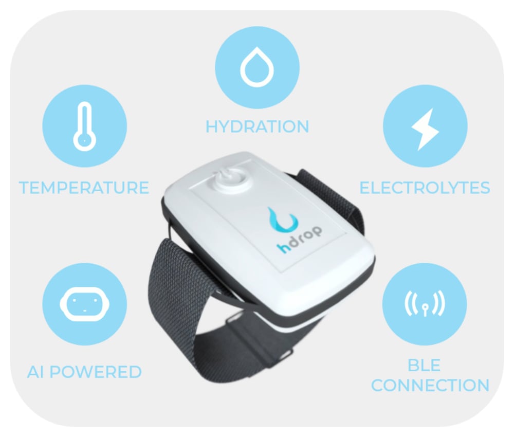 A wearable device able to measure your hydration status in real-time through your sweat, hDrop measures the changes in electrolytes in your sweat as well as your body temperature in order to provide early notifications to the user.