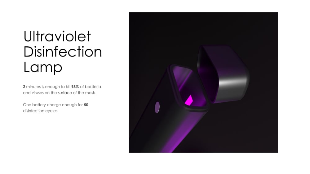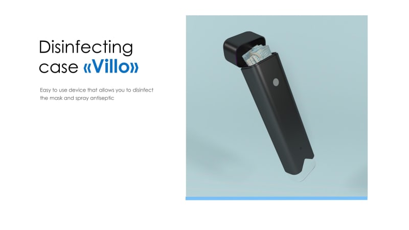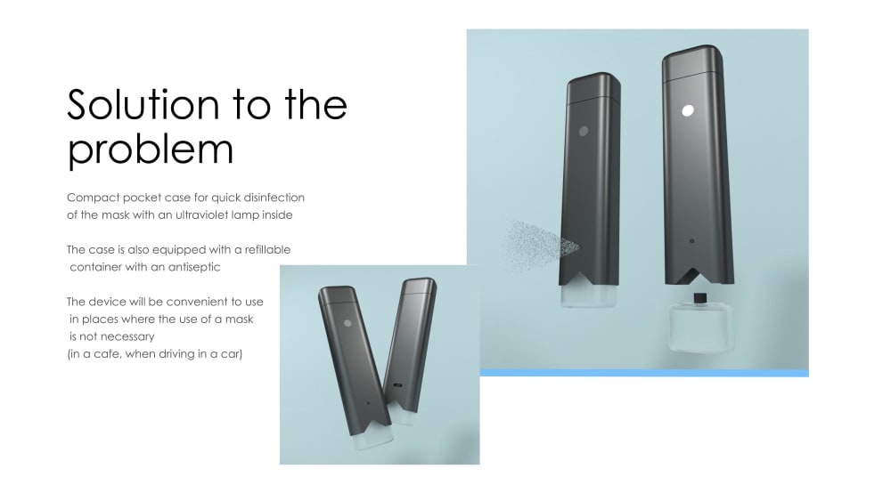 I am deeply concerned about the epidemiological situation in the world. We can stop the pandemic if we observe safety measures and use protective masks and antiseptics. But not everyone in the world does it. Therefore, I developed a special pocket case for mask disinfection. It can also be used as an antiseptic spray. It has a stylish design and will motivate people to take care of safety.
