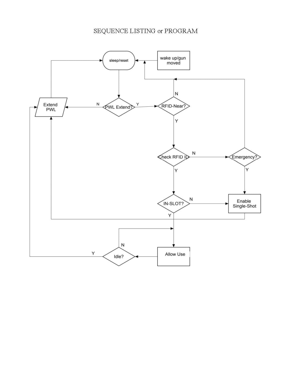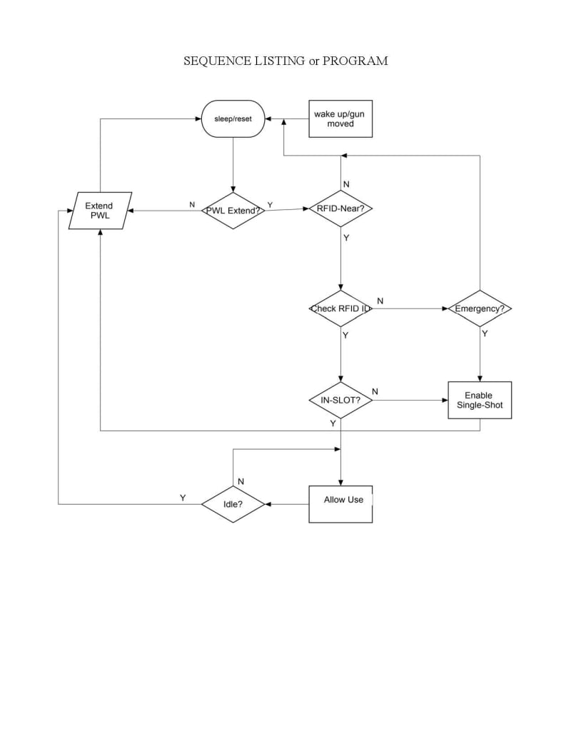 The initial application of the gun lock shall be to modify a simple service revolver, whereupon the stock components are to be removed from the frame. A hole for the pawl is drilled into back of the trigger guard, the pawl shall be extended to lock position then the unit would be positioned on the frame. The special ceramic screws are inserted within the body of the lock, once inserted they may not be removed as they become part of the lock body itself. The inside surface of the stock shall be routed a bit to allow room for the control, most automatics and revolvers have plastic or wood stocks. The stock pieces are replaced onto the frame over the lock. Once installed, the device is charged via an induction charger. The weapon computer sleeps all the time the gun and is idle and is only awakened by a movement of the gun or incoming command module input.