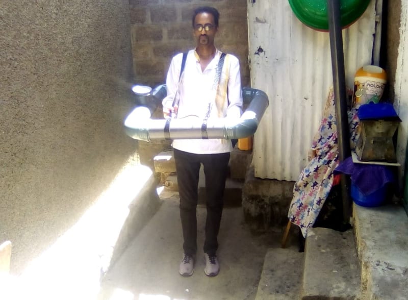 The basic scientific concept for the development of this product is based on the fact that distributed force generates less pressure or impact than concentrated force. Instead of the standard shape of the 25 liter jerry can, Anteneh’s Jerry Can has a torus shape with the same volume as the standard jerry can. For prototyping simplicity, the shape of torus is made square with center to center length of 66cm and pipe diameter of 11cm. At two opposite sides of the pipes there are two attached lathers that are used to hold the Anetenh’s Jerry Can on your shoulder. This will reduce the pressure of the water by distributing the weight of the water and utilize all parts of our body for support. To maintain the load close to center of gravity, which is the person carrying it, the diameter of the pipe can be varied and the length of the pipe will be varied depending up on the amount of variation of the diameter based on the size model of the user. Which means for thin peoples the diameter is increased and length will be decreased and for plus size people the diameter is decreased and the length will be increased. Both lathers are attached to each other with a lather for hand grab in case two people want to transport one Anteneh’s Jerry Can.