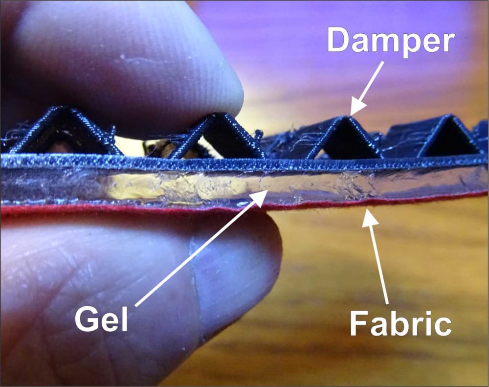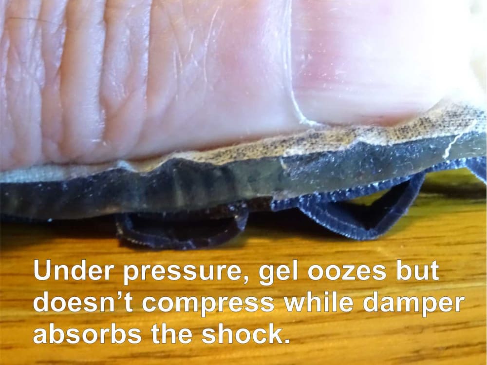 Current shock absorbing technology uses either a foam or gel material. While both are soft and flexible, unless used in a thick manner, they will under time and pressure flatten out resulting in a hard surface. Thickness is an important feature in that the thinner the better for most applications.