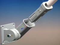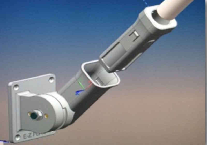 In Short: A unique flag pole adapter is attached to the end of the flag pole with a thumb screw. This adapter enables the flag pole to 'snap' into the bracket. The flag now can be raised/rotated up using a specialized 'hoist' tool. This same tool is also used to lower the flag. Overall a new and 'safe' system for mounting a flag without needing a ladder.