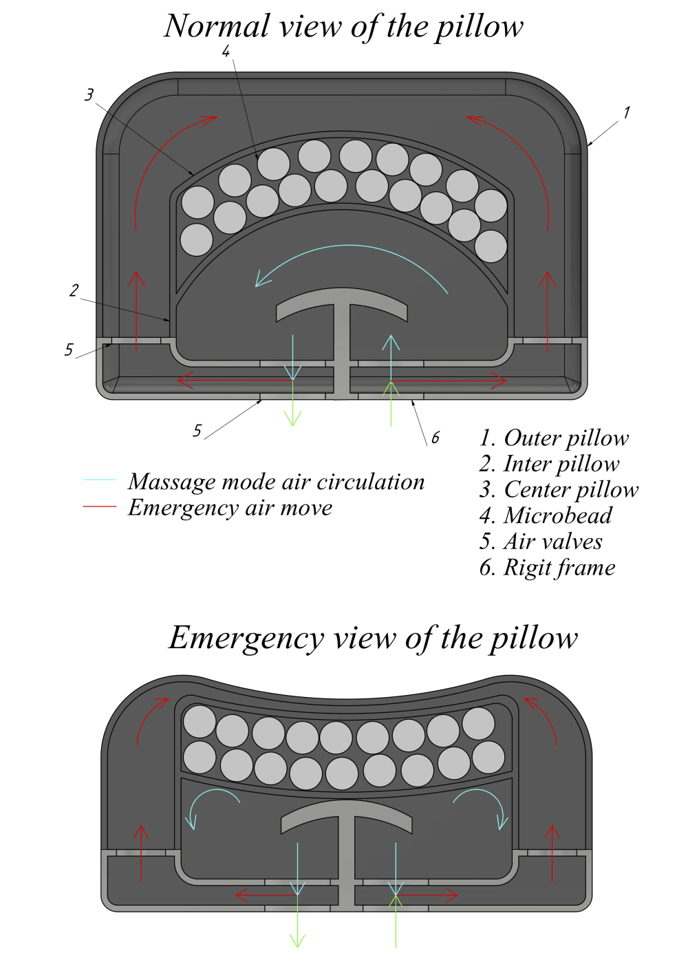 In emergency mode, air from inter pillow comes to the outer pillow, and then the body contacts the microbeads in time of crashing.