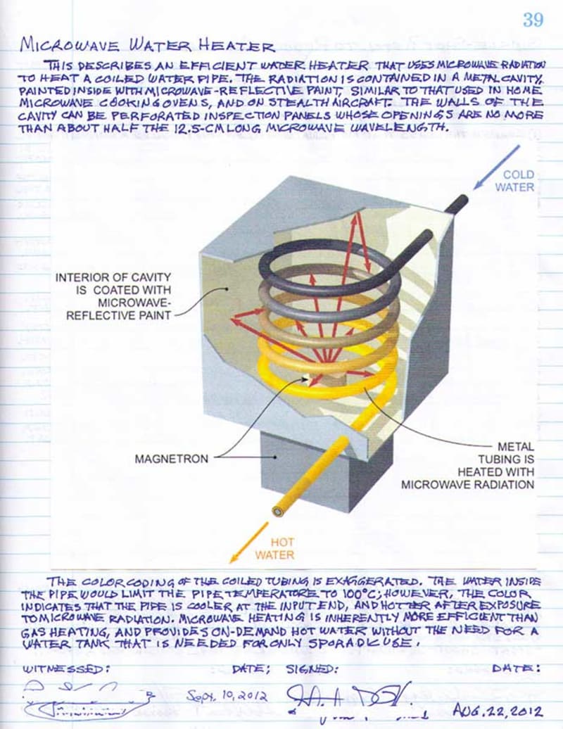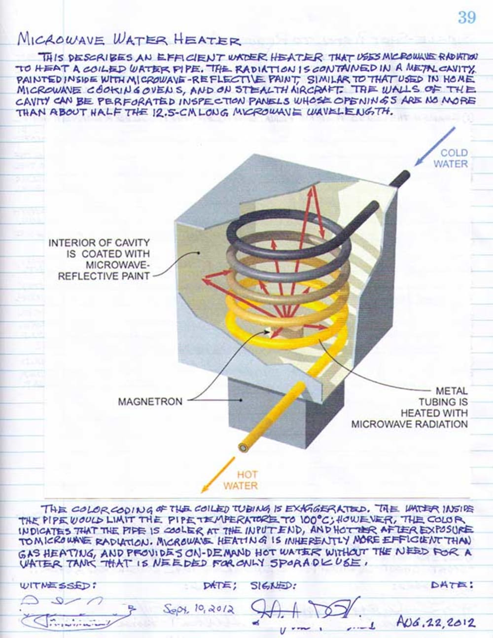 This describes an efficient water heater that uses microwave radiation to heat a coiled water pipe. The radiation is contained in a metal cavity, painted inside with microwave-reflective paint, similar to that used in home microwave cooking ovens, and on stealth aircraft. The walls of the cavity can be perforated inspection panels whose openings are no more than about half the 12.5-cm long microwave wavelength.