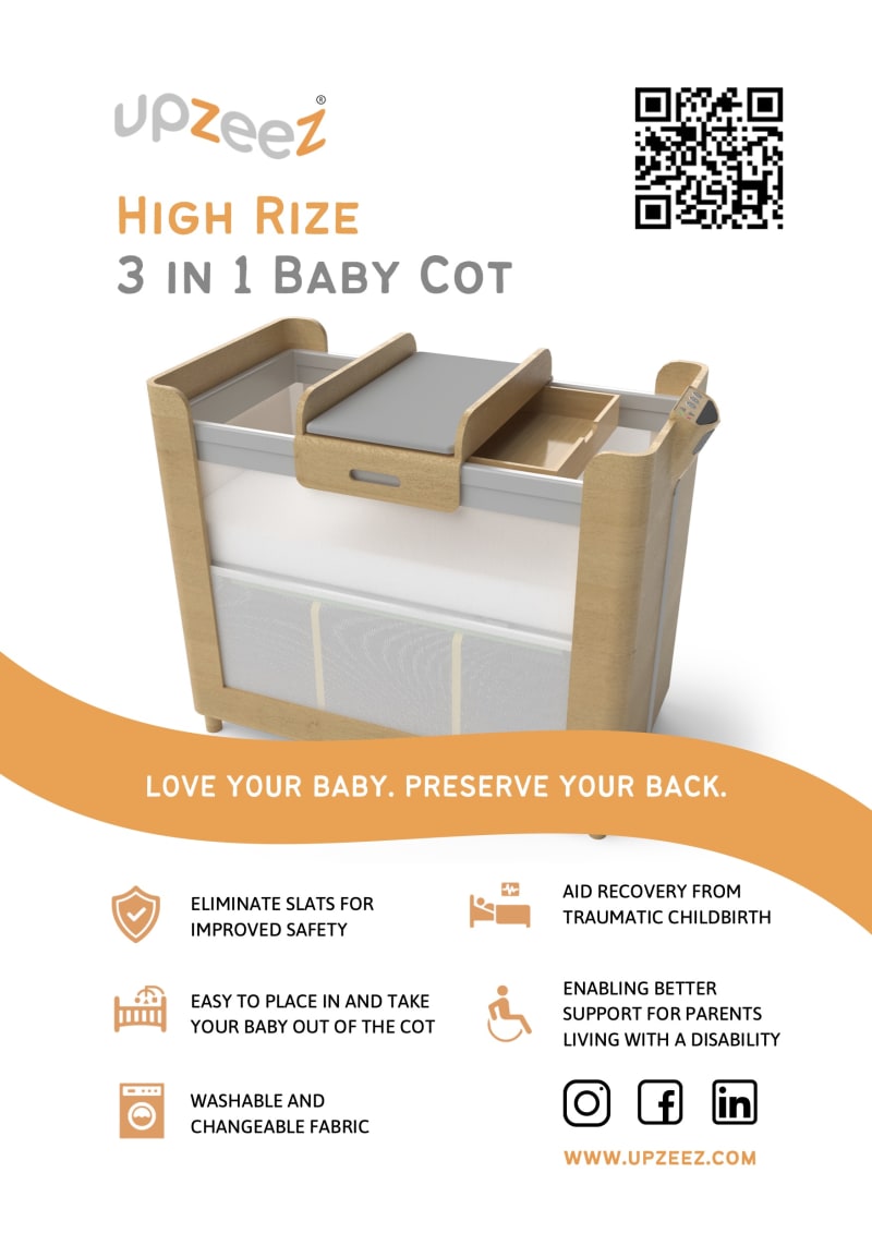 Upzeez is an innovative crib that challenges the existing baby products in the market. Our smart 3 in 1 High-Rize Baby Crib is a market disruptor and caters to a wider target audience that struggles with the conventional cribs. This includes women that have had a traumatic childbirth as well as those parents with disabilities. Having studied the market, we understand that one of the biggest complaints with the conventional crib is that the height is too low, which often results in long-term back conditions for many parents. Often women that have had a traumatic birth or C-Section find it extremely hard to move their child in and out of the crib without assistance. There have also been complaints about children’s arm or leg getting caught up in the slats.